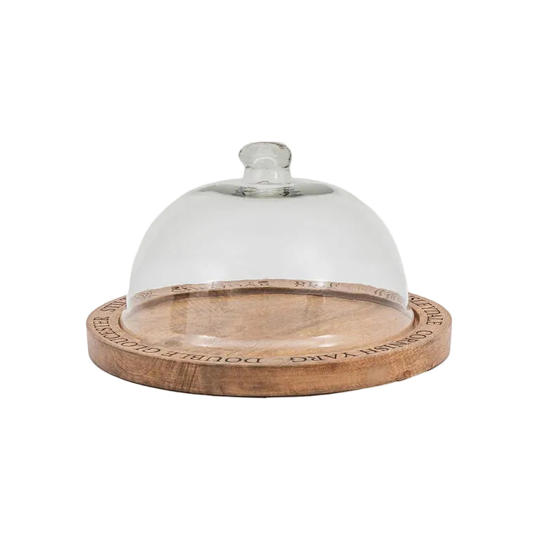 The handmade rich mango wood board of this cheese dome is adorned with your favourite cheese names, forming a border around a glass dome. Perfect for presenting cheeses, cakes and other foods.