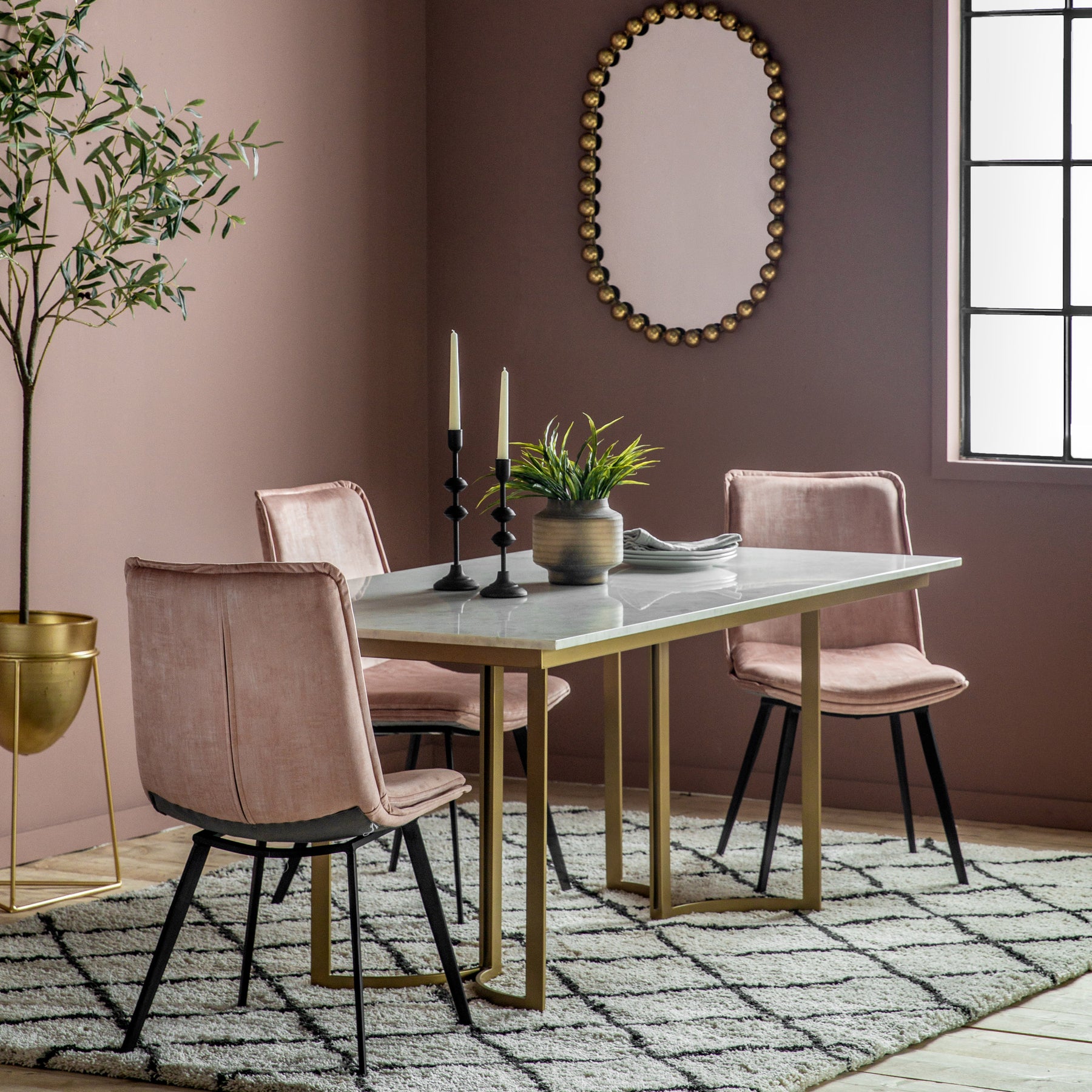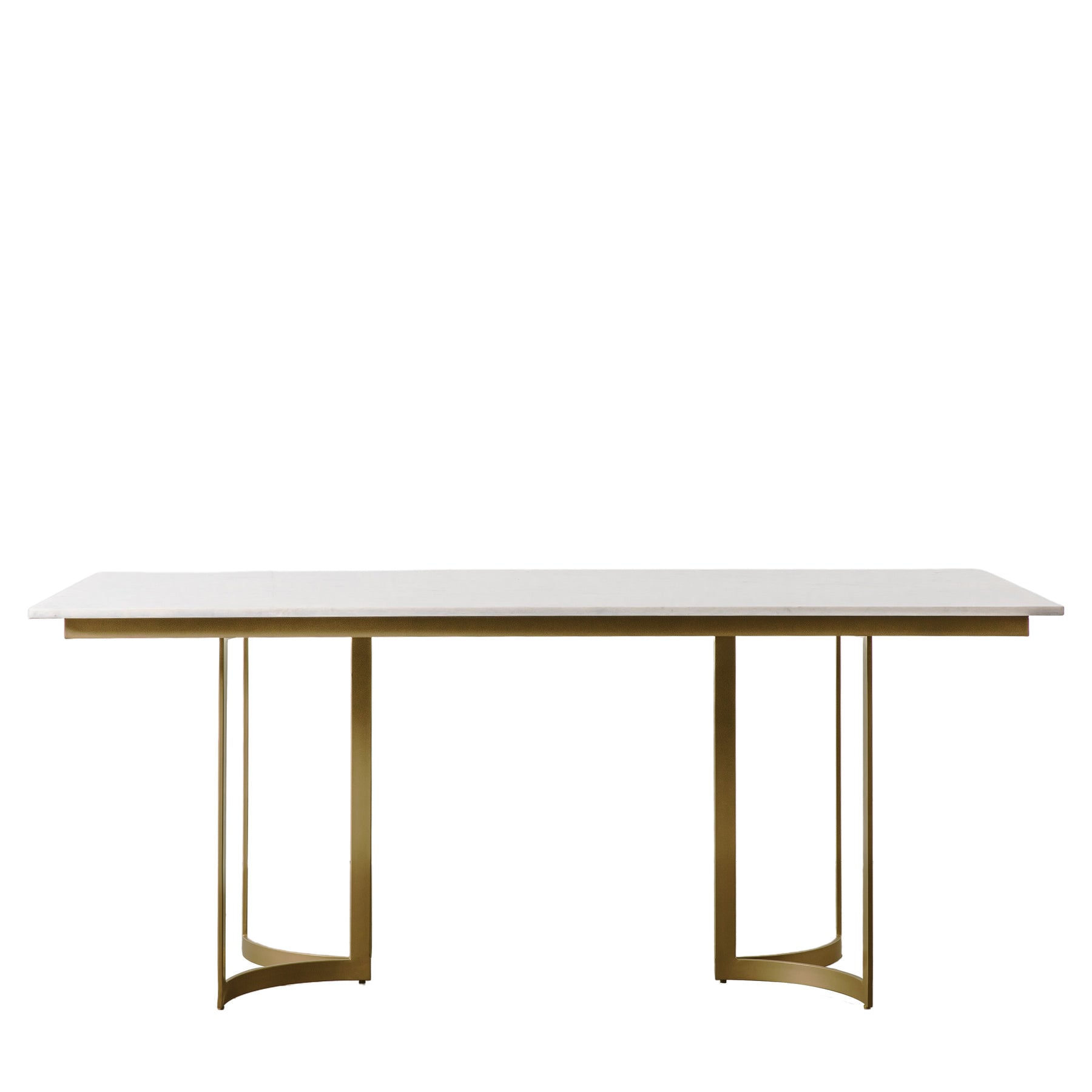 Stunning dining table which features a white marble top paired with a metal base in a brushed brass finish, to create a sophisticated contemporary piece. It is also offered with a matt black base.