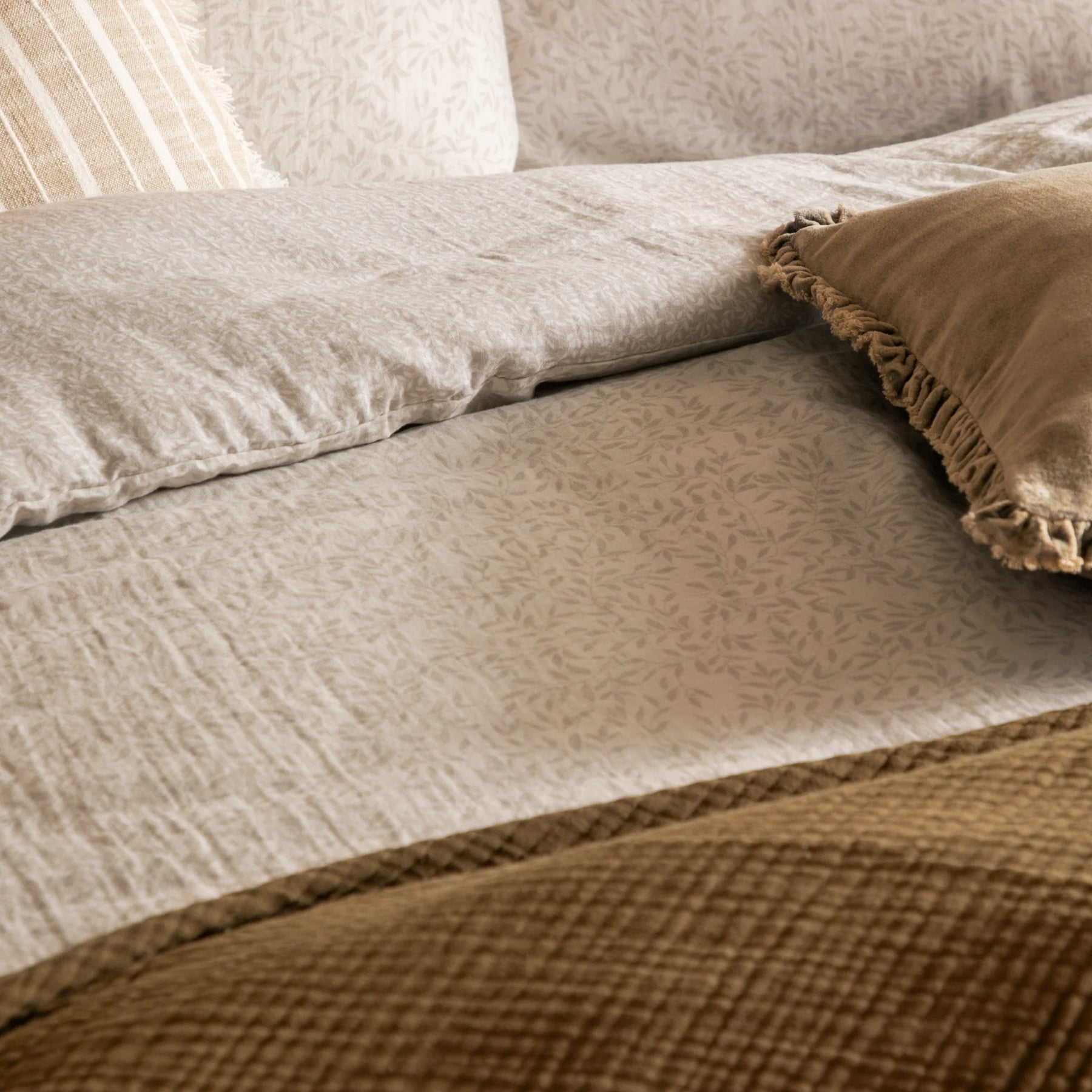 The Perrie Leaf Duvet Cover Set blends natural beauty with effortless comfort. Crafted from ultra-soft double-layered muslin cotton, it features a reversible ditsy leaf print in a neutral palette, evoking a relaxed and natural aesthetic. The contrasting smaller-scale design on the reverse allows versatility in styling while maintaining the same soft muslin texture. Perfectly suited to those valuing simple yet high-quality materials, this bedding fosters a connection to nature with its breathable cotton fabric and laid-back appeal. A versatile and thoughtful addition to any space.