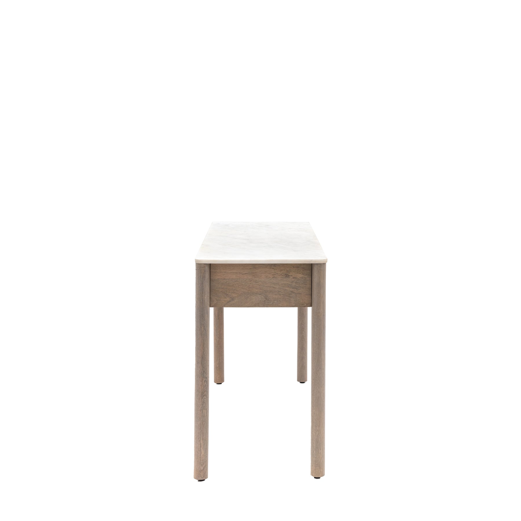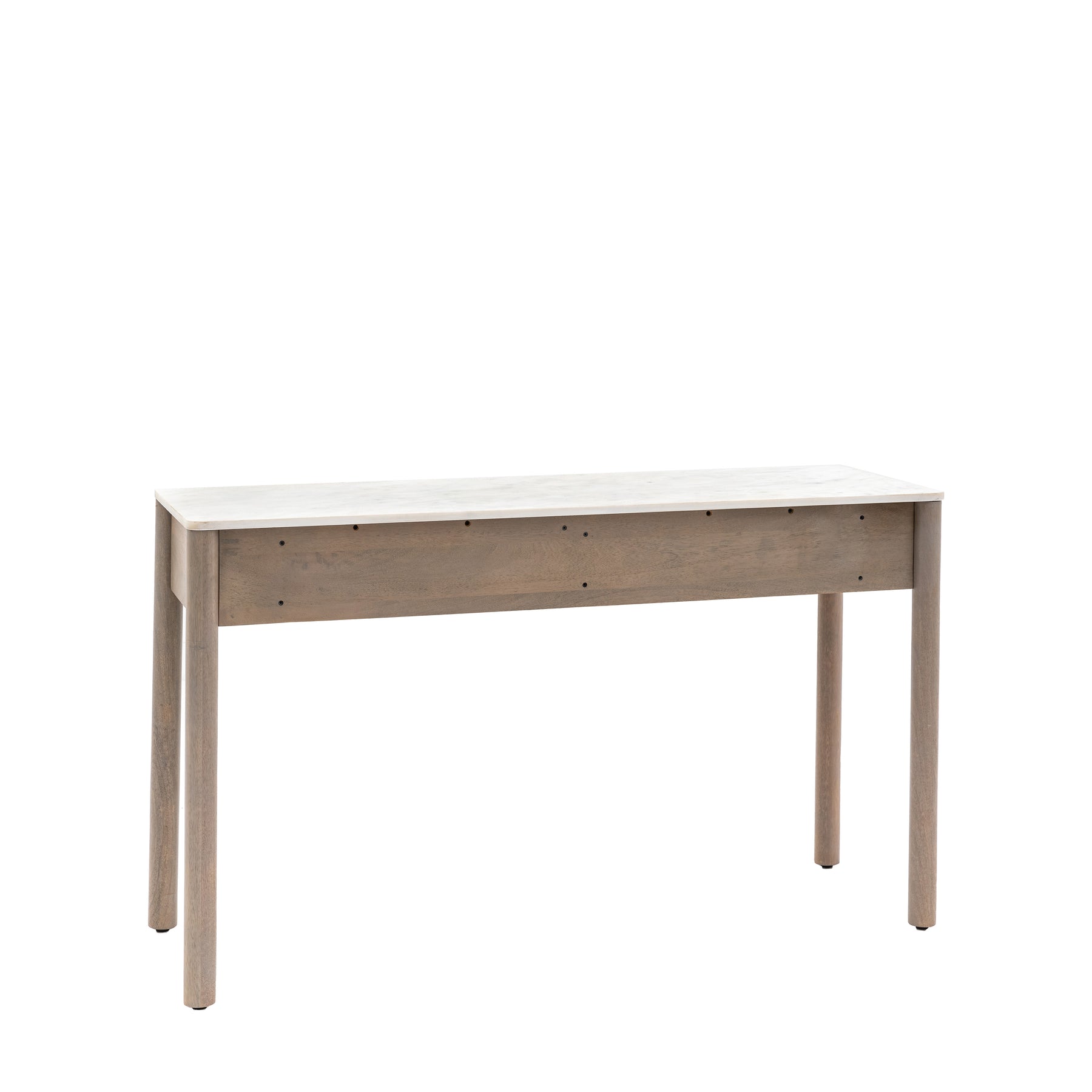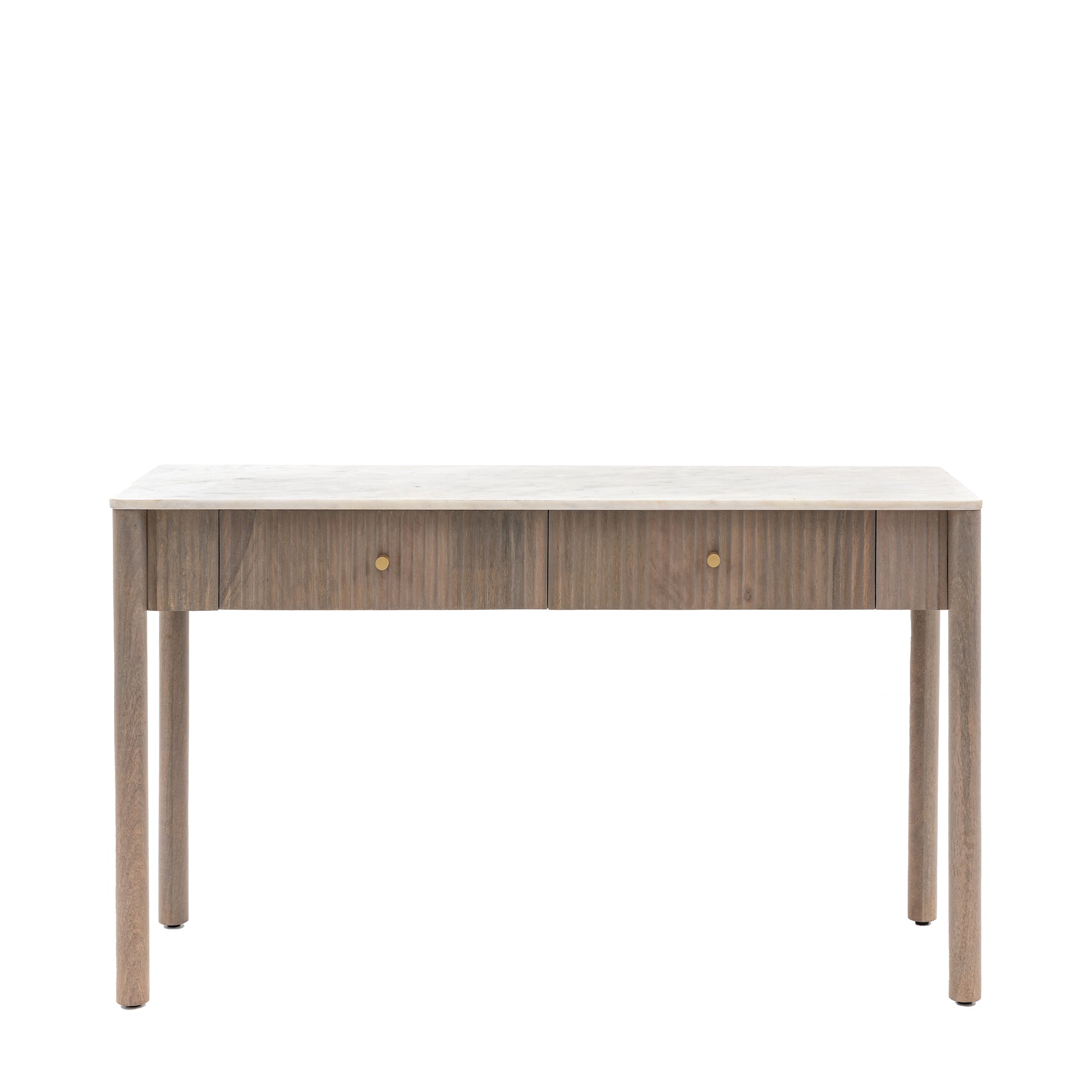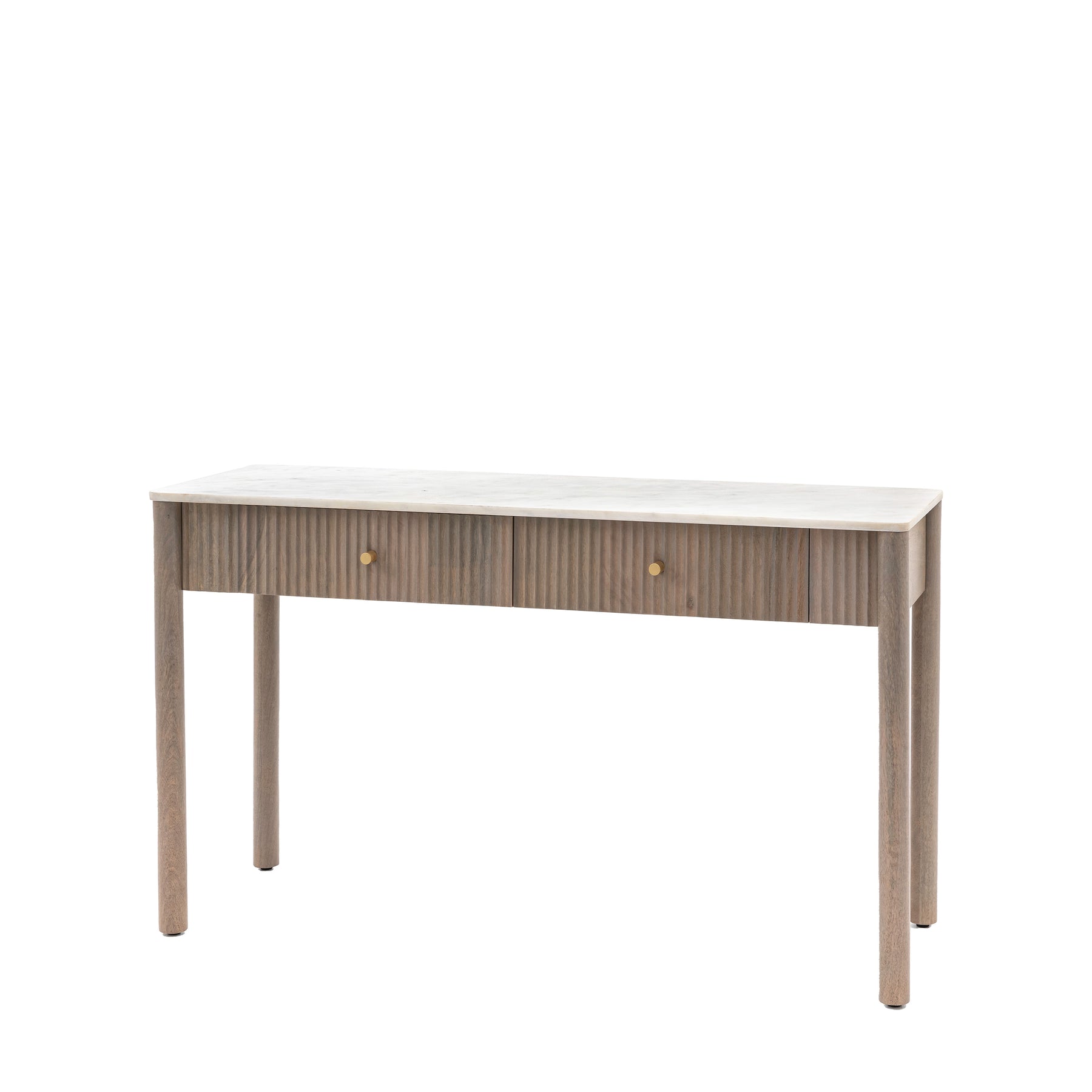 This on trend console table offers a modern classic look. Crafted from solid mango wood, with a striking vertical ribbed feature on the drawers, and a polished Indian white Carrera marble top with classic grey/blue veins running through it, the table exudes timeless quality & beauty. Matching pieces are available.
