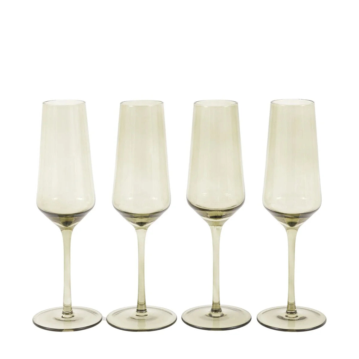 Sip champagne in style with this elegant set of 4 Smokey green glass flute glasses.