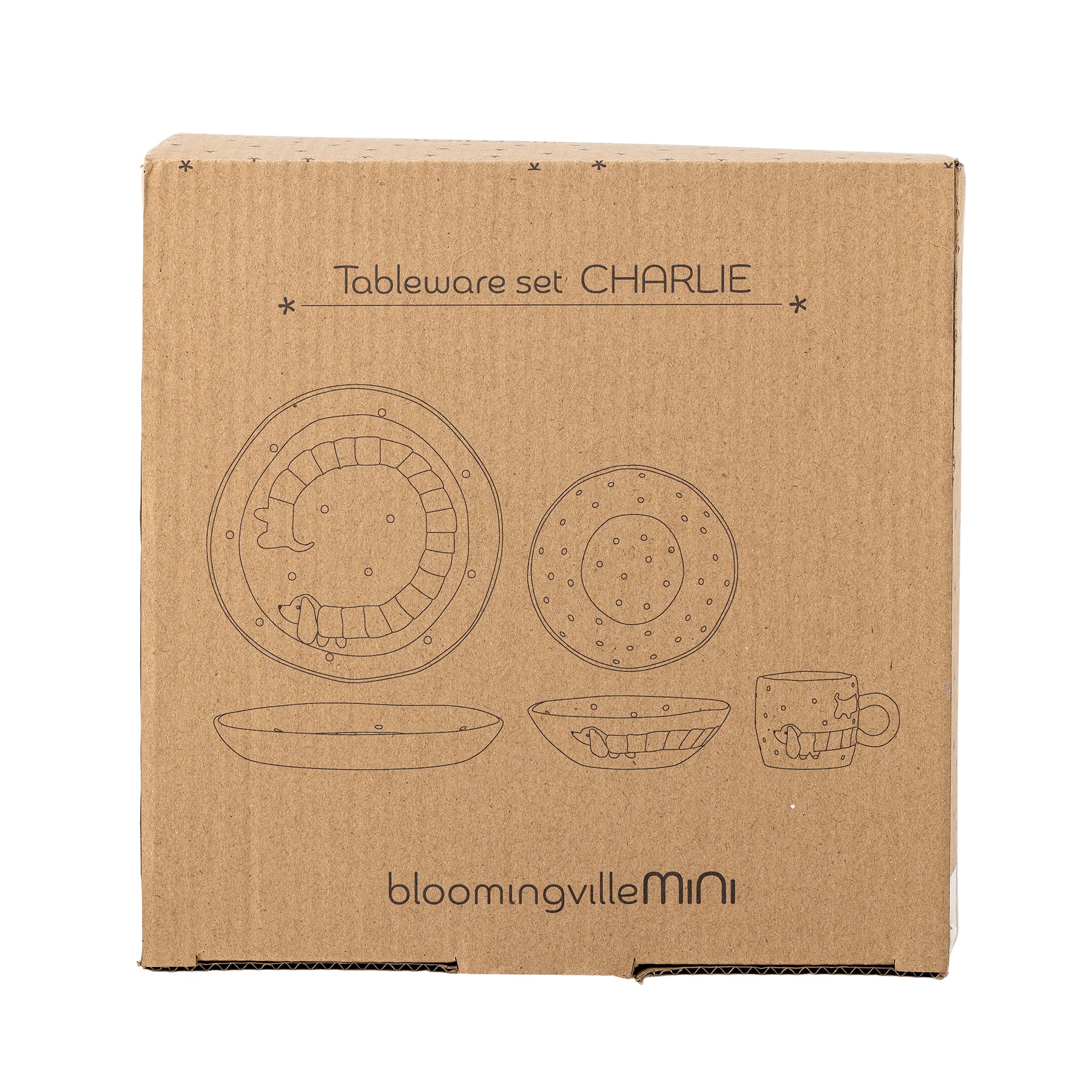 The Charlie Tableware Set by Bloomingville MINI brings joy to the dining table with its playful and colorful design. The set includes a cup, a bowl, and a plate, all decorated with a cute dog motif and delicate dots in soft hues. It is perfect for everyday use and will undoubtedly bring smiles to both children and adults. The tableware set is made of stoneware.