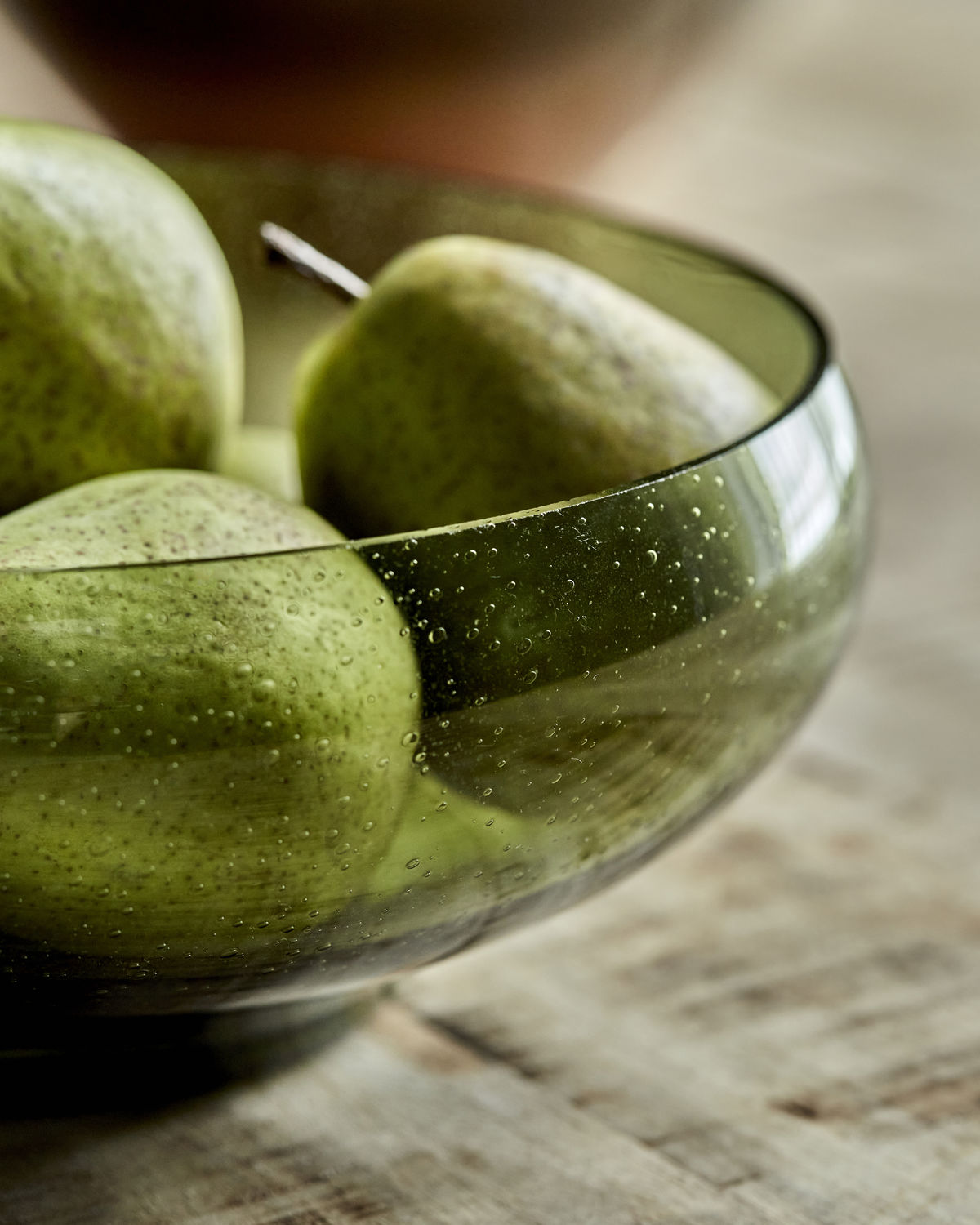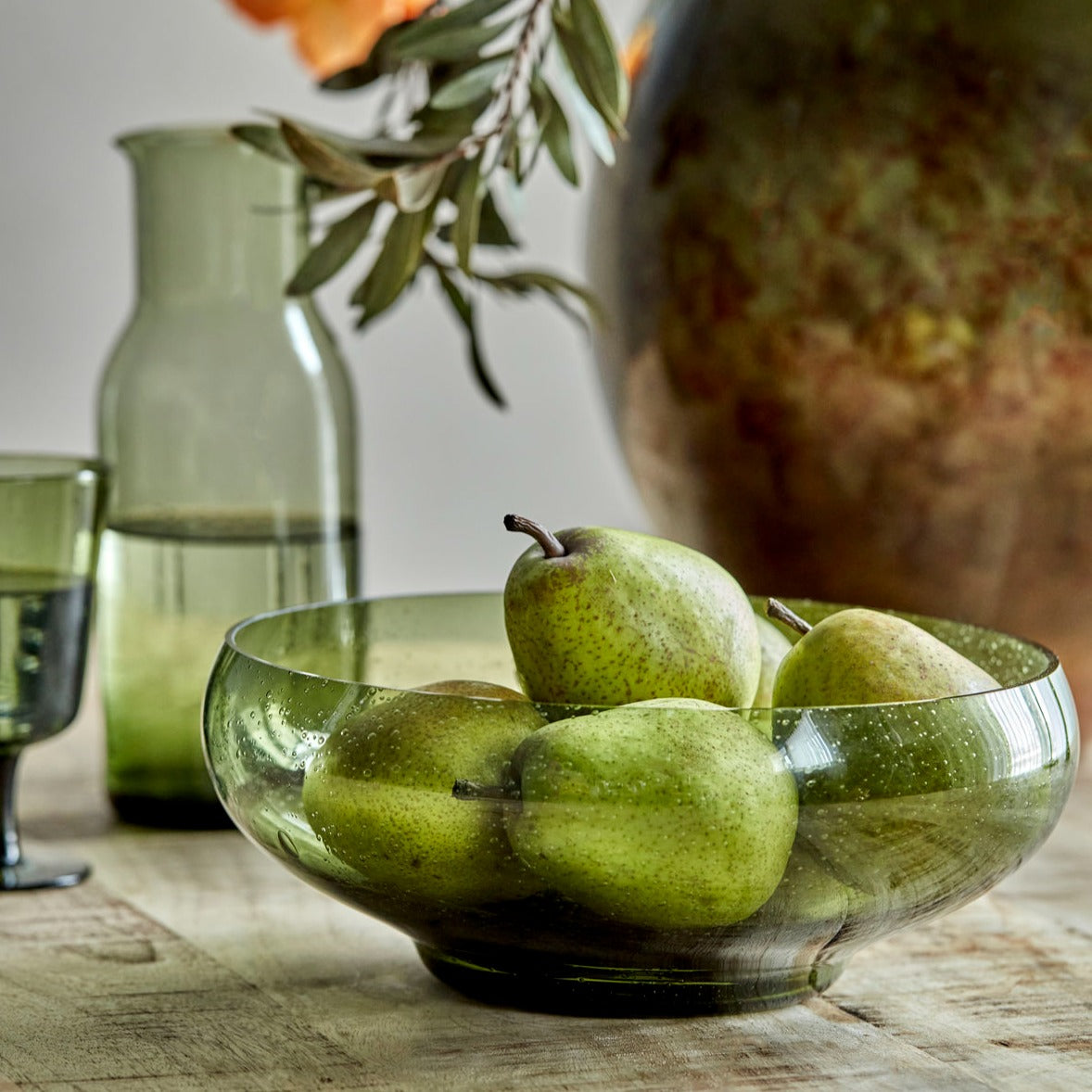 This on trend handmade handblown green glass bowl has a pretty decorative bubble effect which matches our new green carafe .