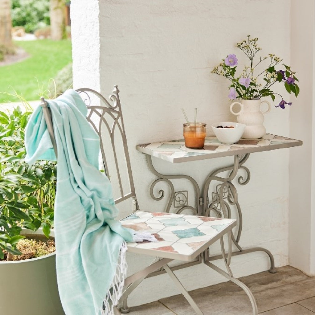 Portofino bistrosættet består af et cirkulært bistrobord og to stole, der viser et fantastisk mosaikmønster i koral, fersken, marineblå og grøn.