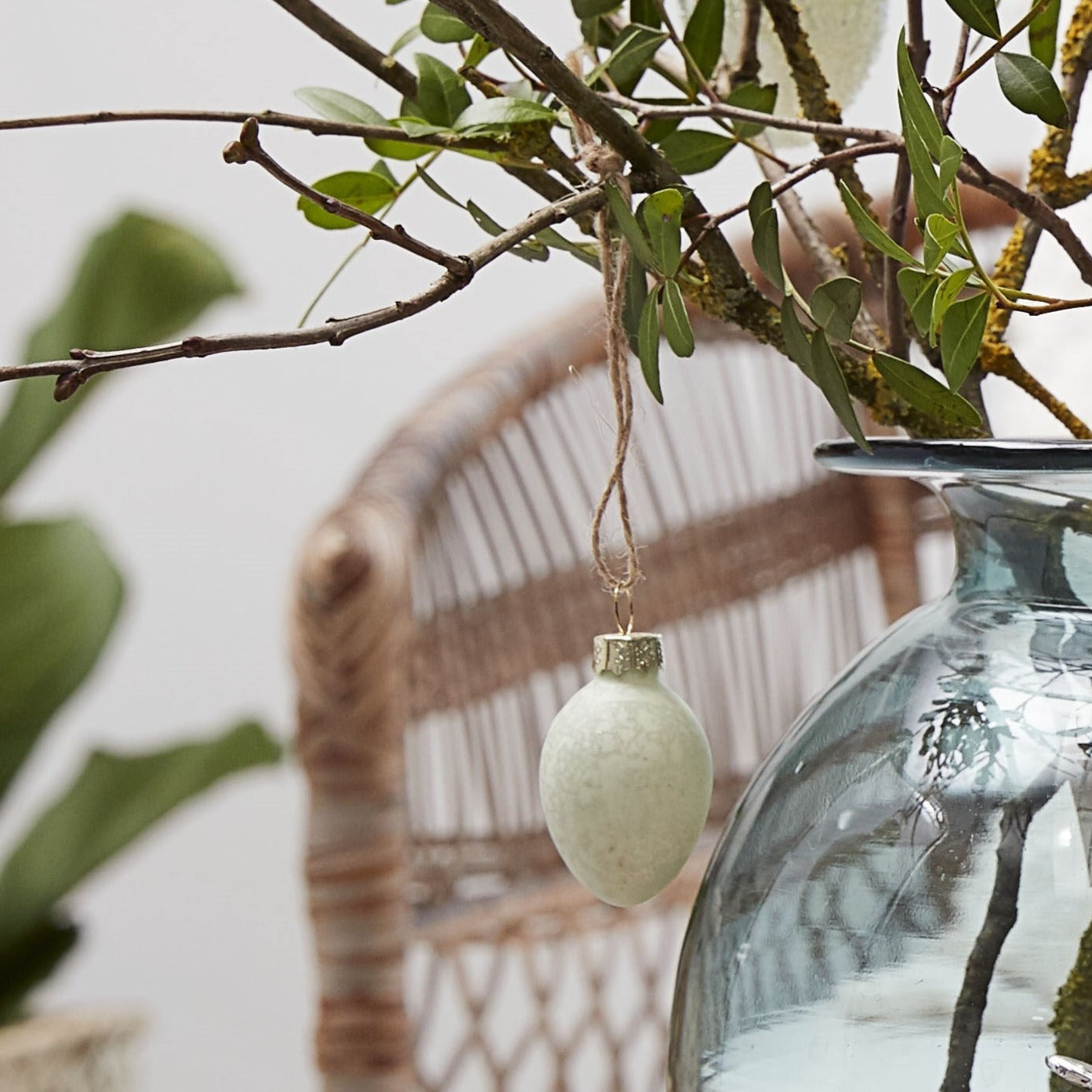 Disse sarte mintgrønne glas hængende æg har en frostet effekt og ser dejlige ud med forårsgrene og grønt løv.
