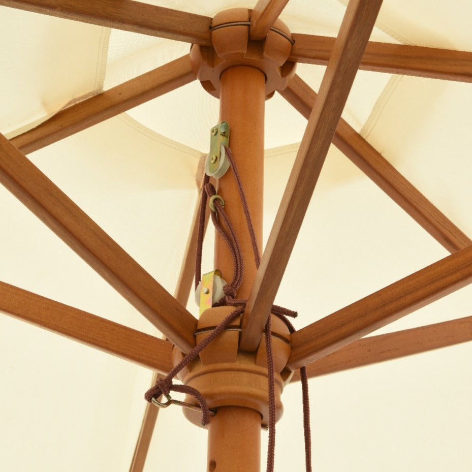 Stængerne er lavet af hårdttræ med en let teak finish og skærmen er lavet af vandtæt stof med UV-beskyttelse.
