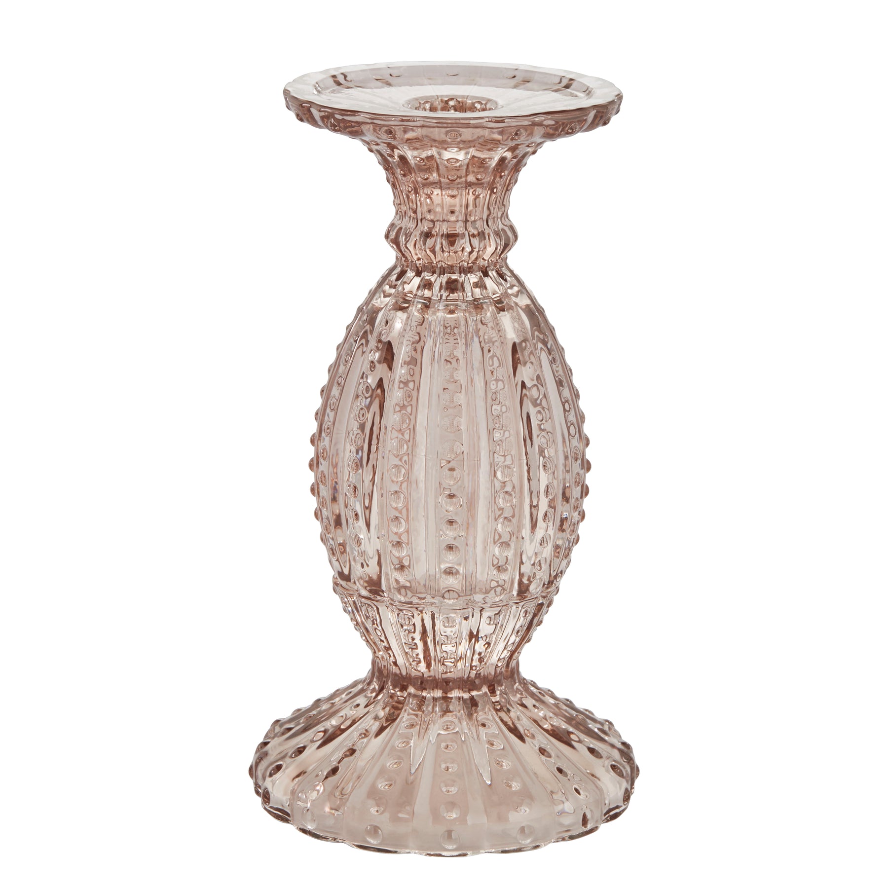 Elegant lyserød buet lysestage med en delikat præget finish.