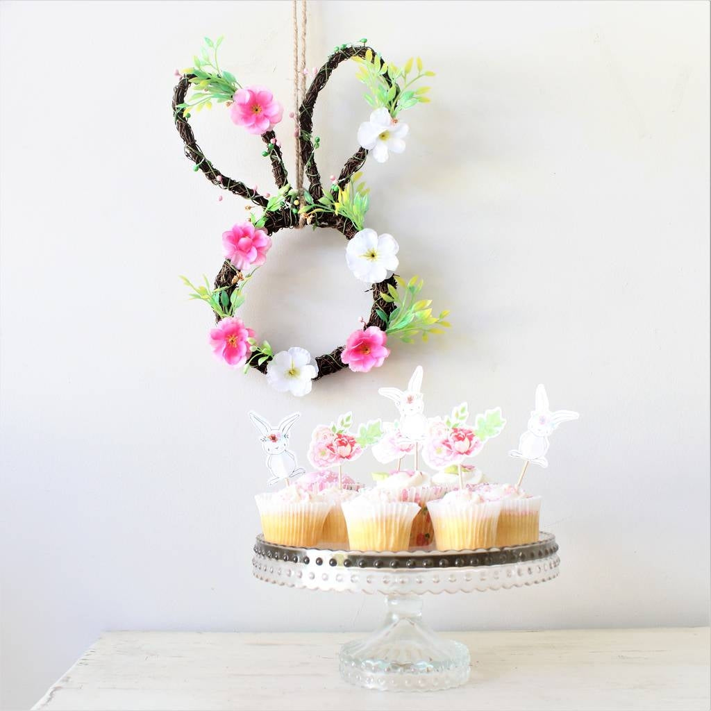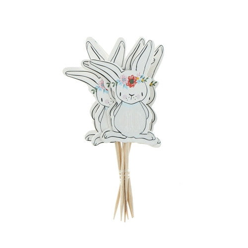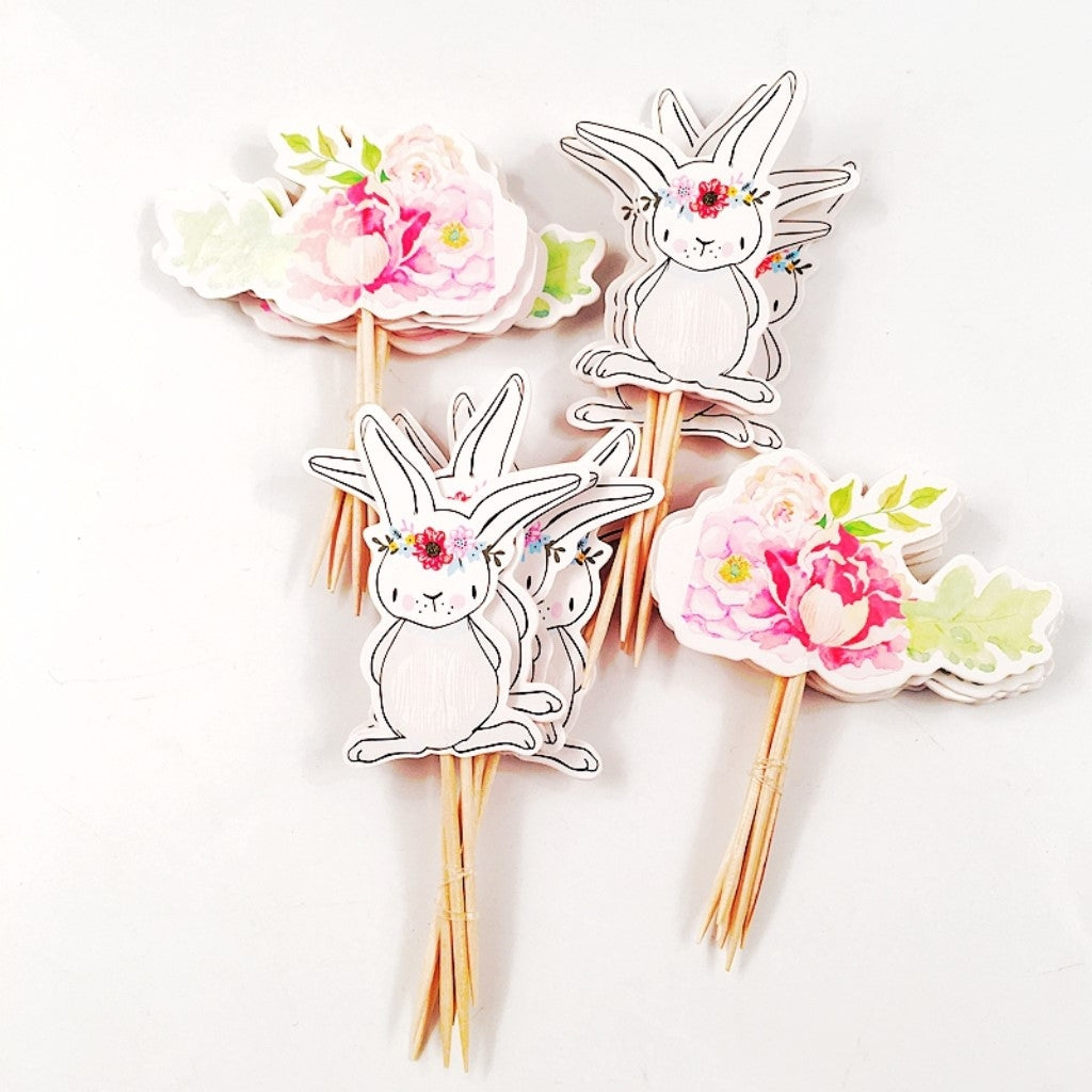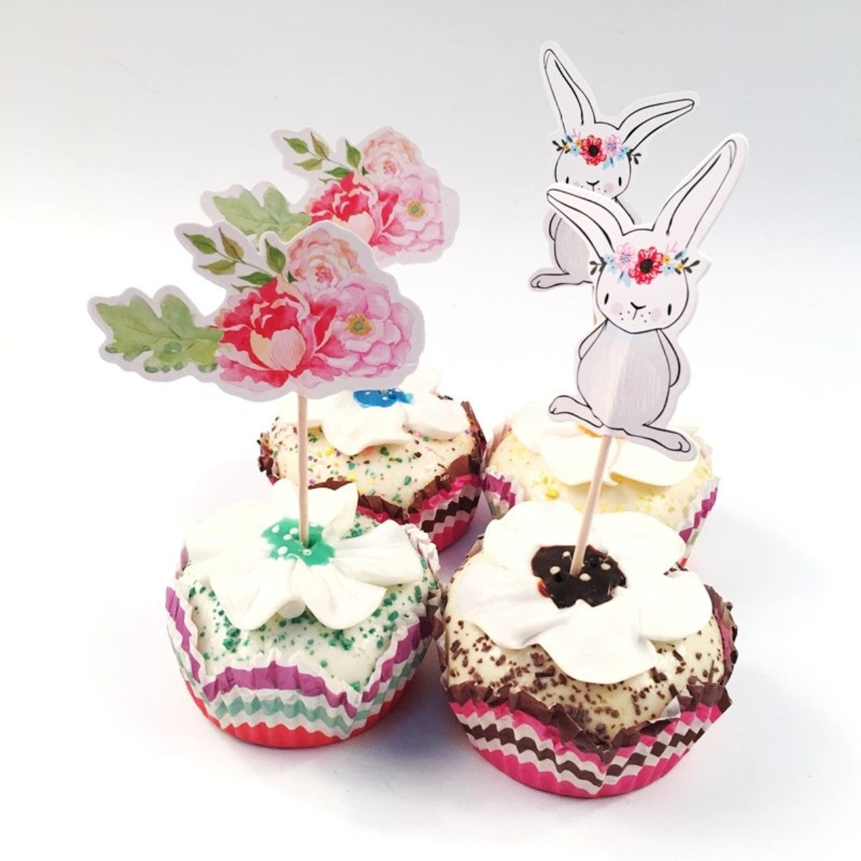 Et sæt med 12 smukke kage toppers i en blanding af to søde designs, en kanin og et blomsterprint.