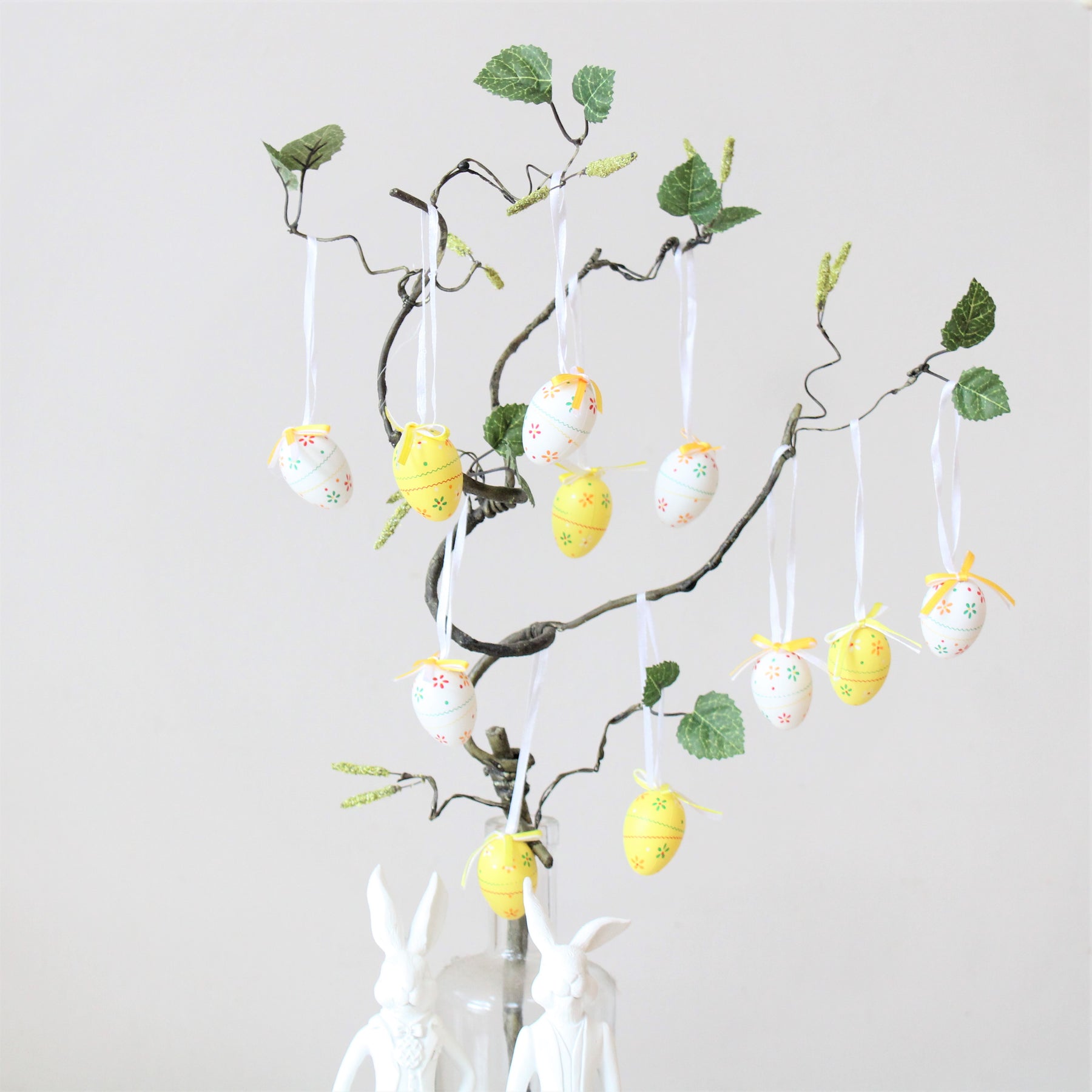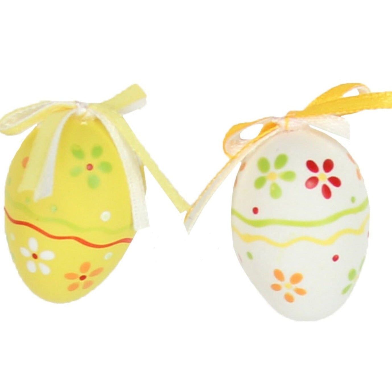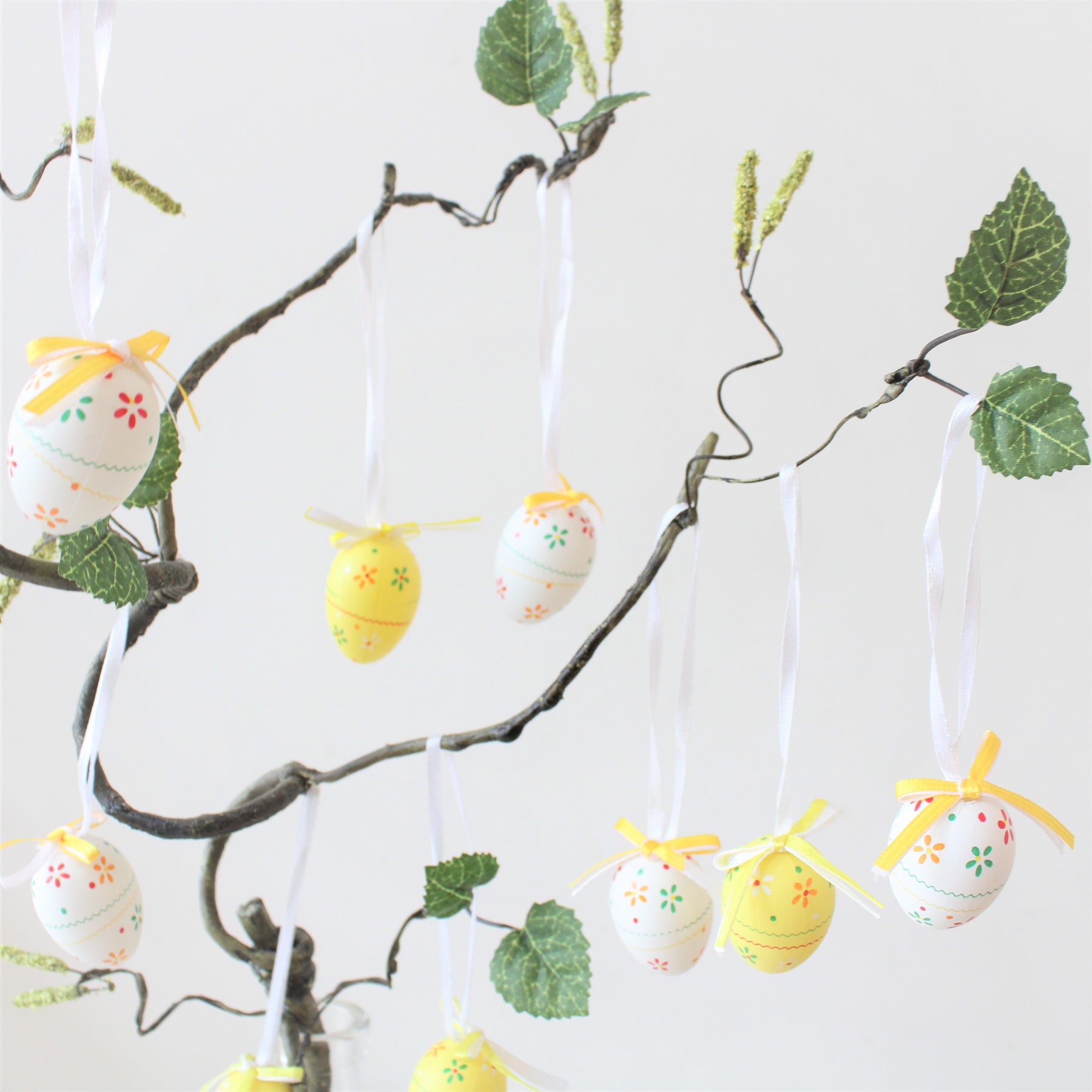 Disse gule og hvide ditsy blomsterhængende æg har kontrasterende bånd og er perfekte til at dekorere et påsketræ eller en gren.
