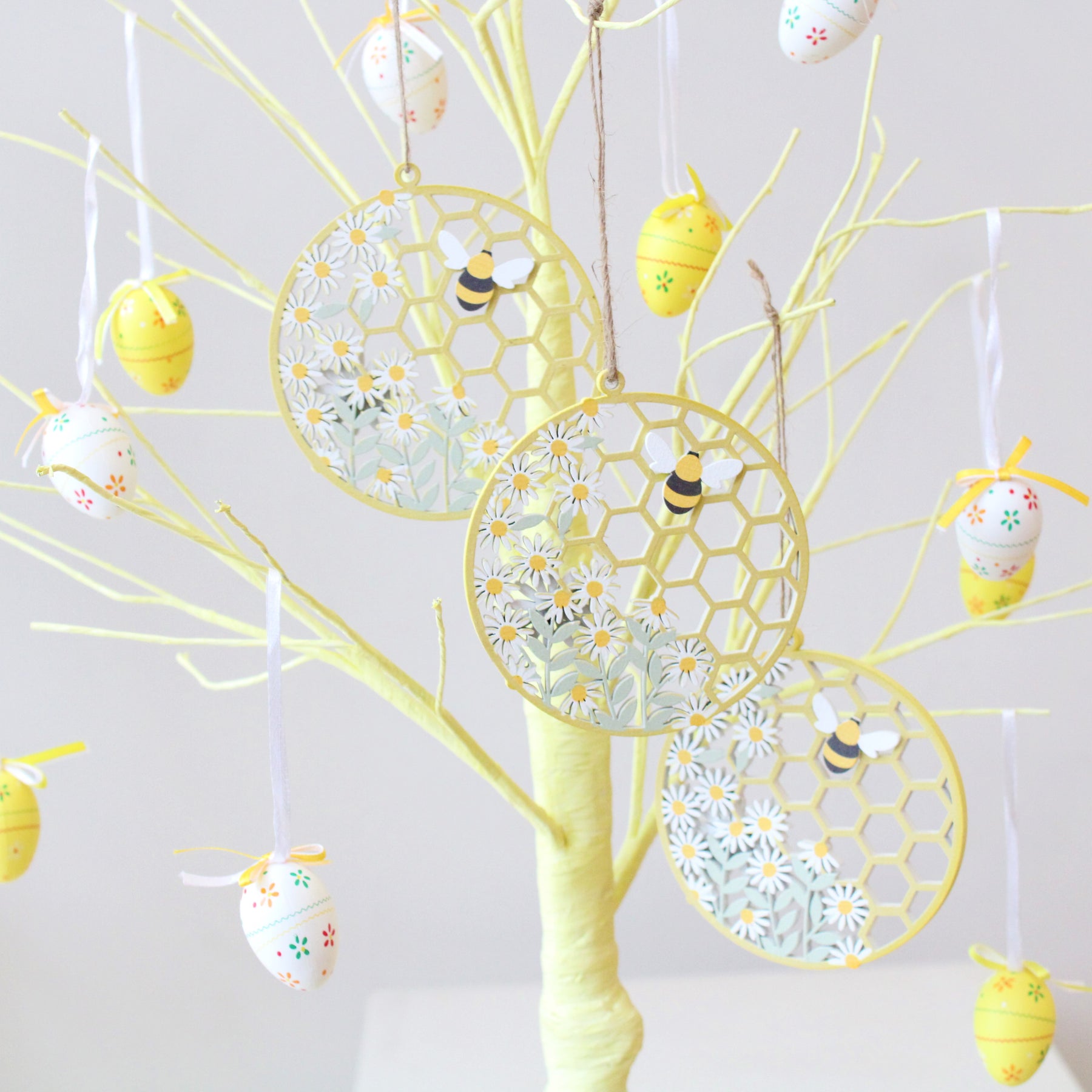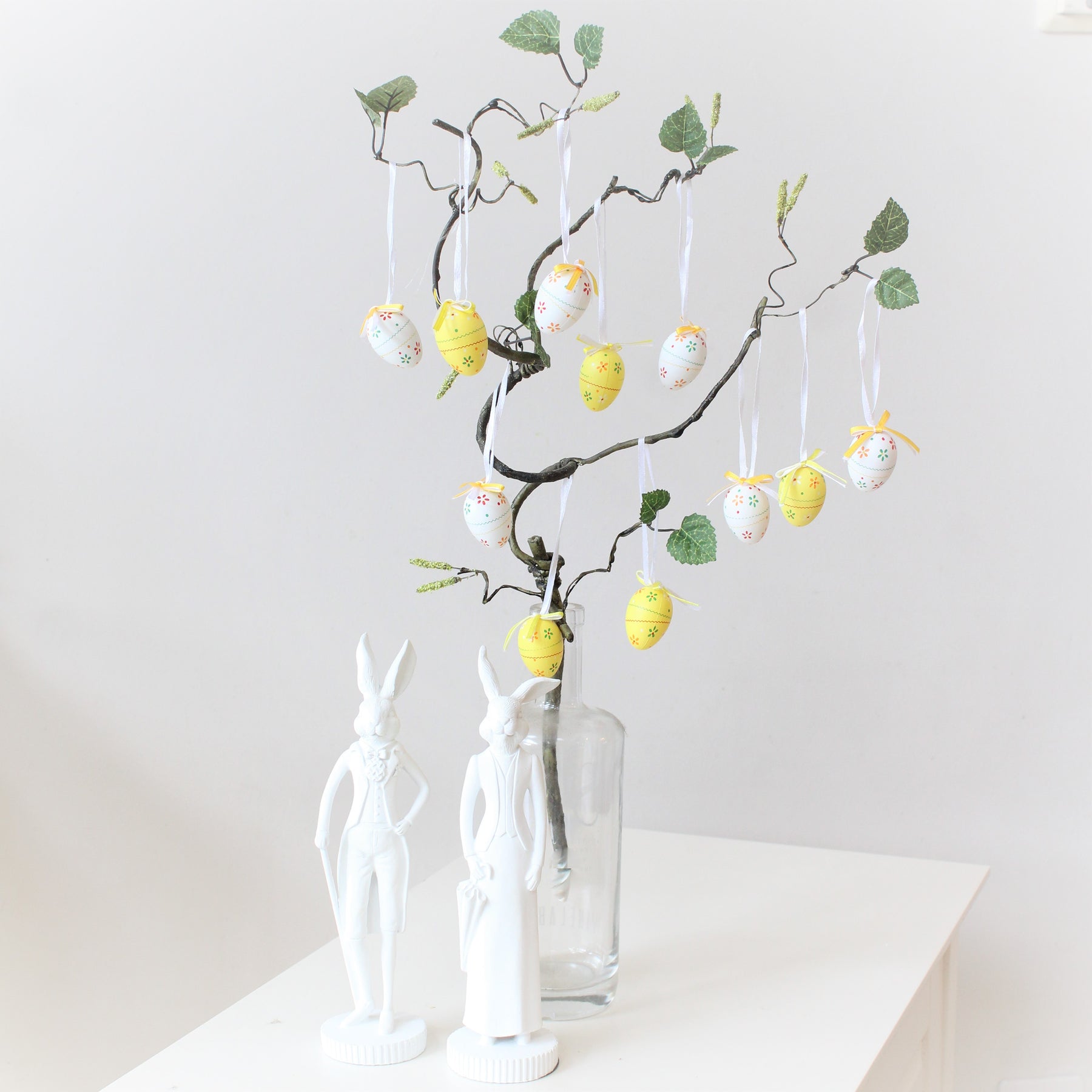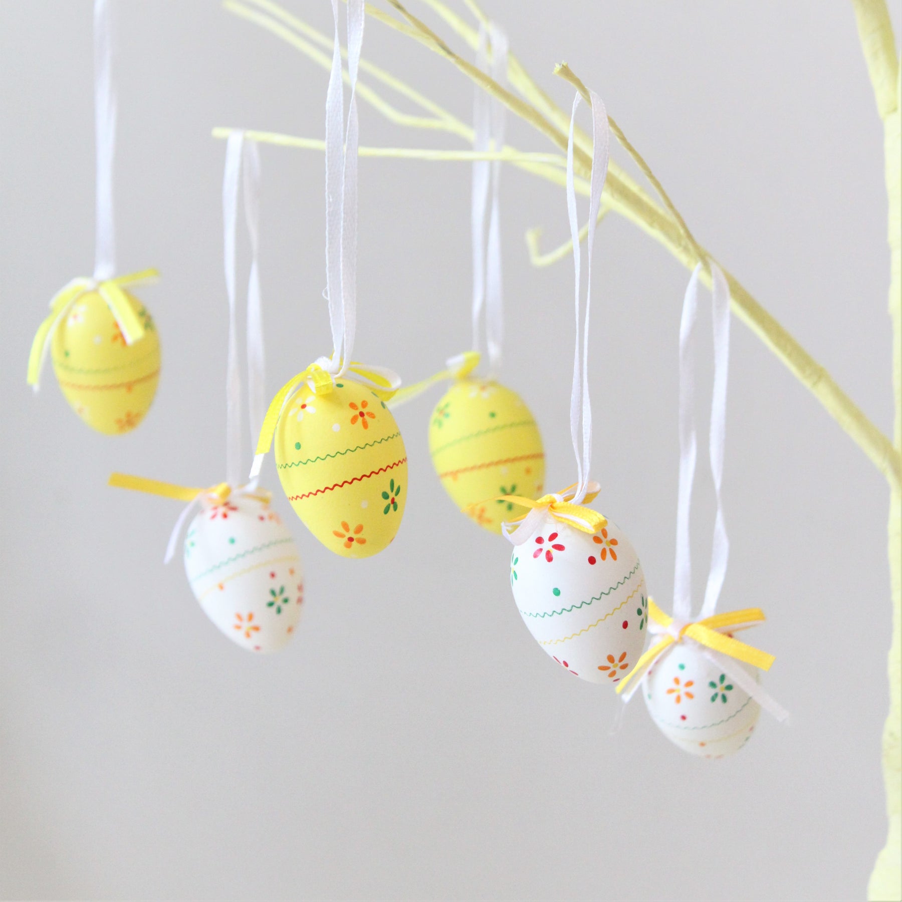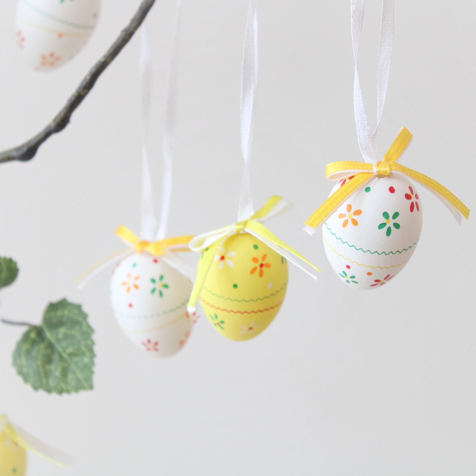 Disse gule og hvide ditsy blomsterhængende æg har kontrasterende bånd og er perfekte til at dekorere et påsketræ eller en gren.