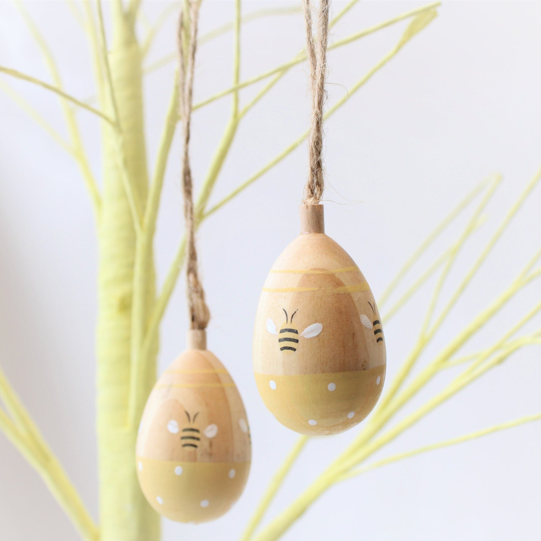 Disse store naturlige trææg er malet med bier og en gul og hvid prikket base.