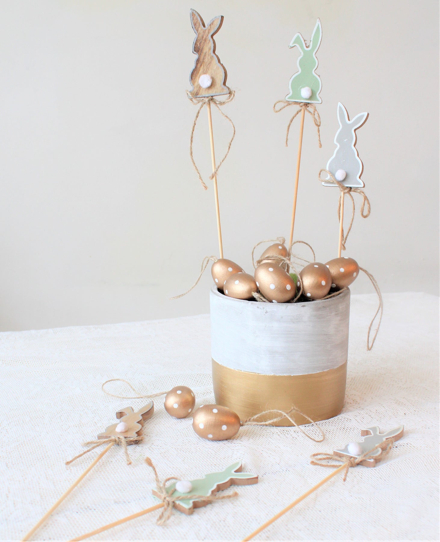 Sættet består af 6 kaninhakke, 2 grå, 2 mintgrønne og 2 naturlige, alle afsluttet med en pomponhale og jutesløjfe.
