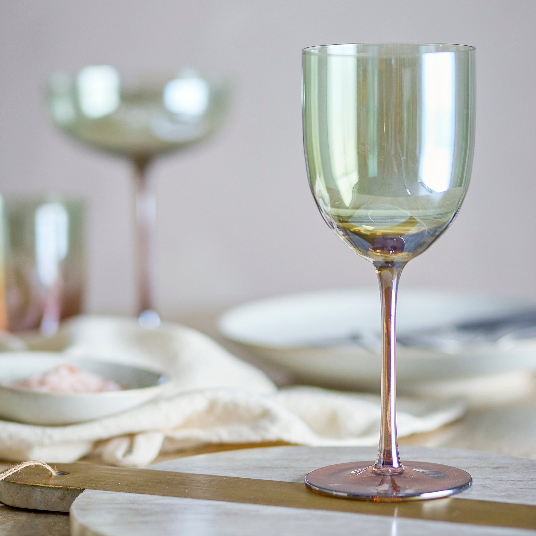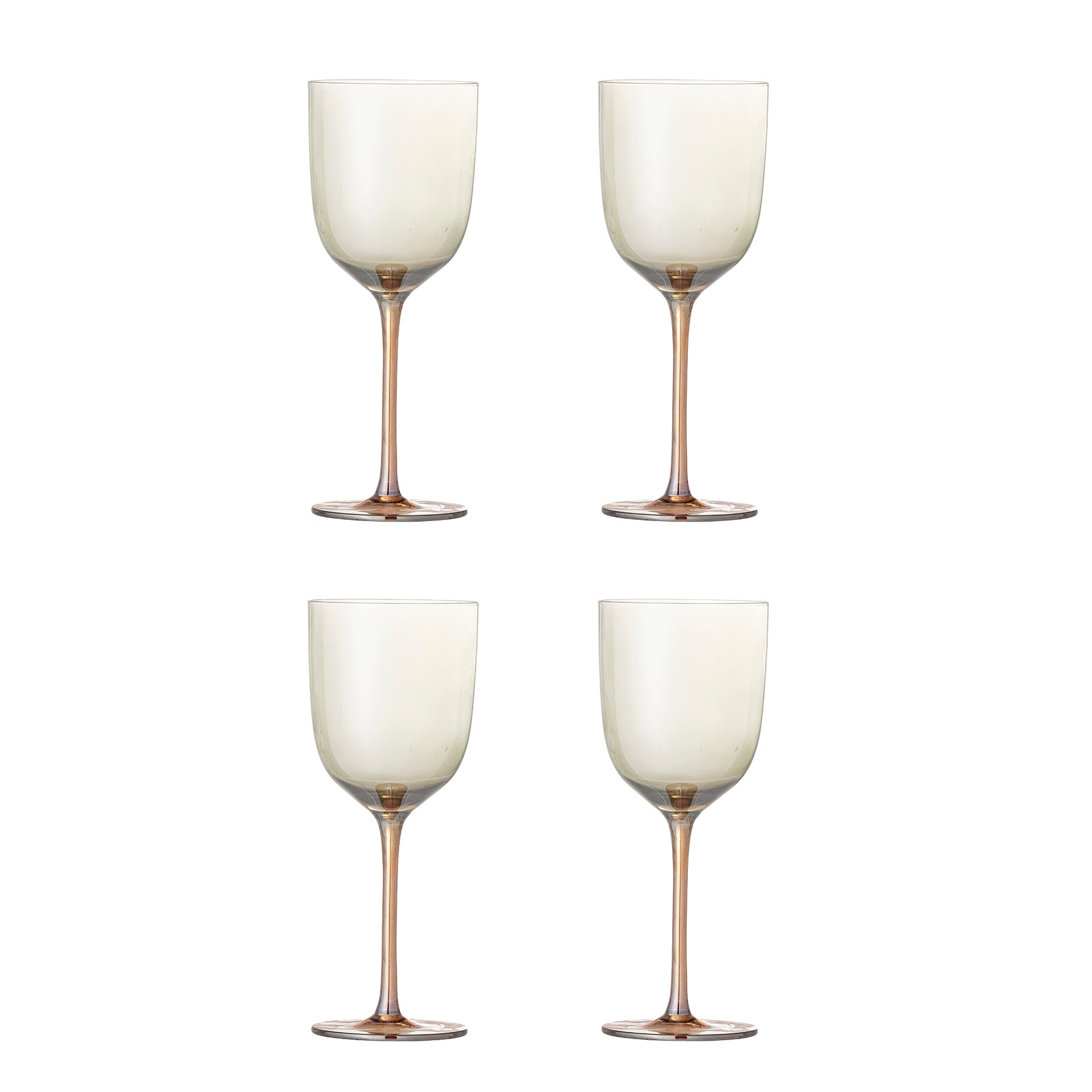 The Aston Wine Glass by Bloomingville has a bronze-colored finish with a mother-of-pearl rim that catches the light beautifully. The refined look makes them ideal for both wine and decorative table settings. The set consists of 4 glasses.