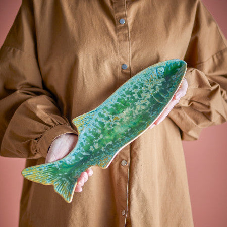 The Hadden Serving Plate by Creative Collection is made of stoneware and shaped like a fish. The green reactive glaze creates subtle color variations and gives a unique look to each dish. Perfect for small servings or as decoration.