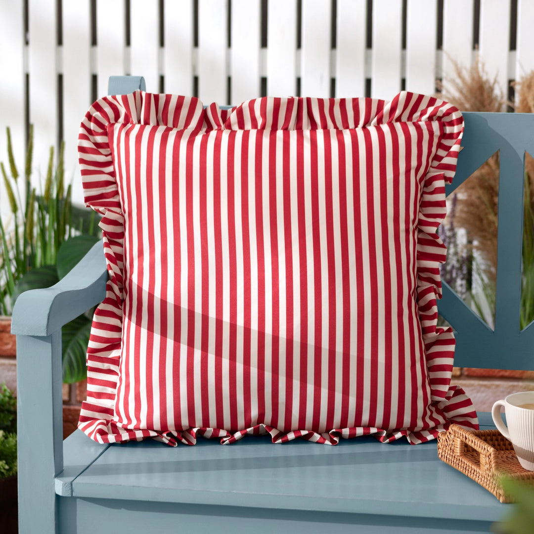 Millie Ruffle Striped Outdoor Cushion in Candy Red