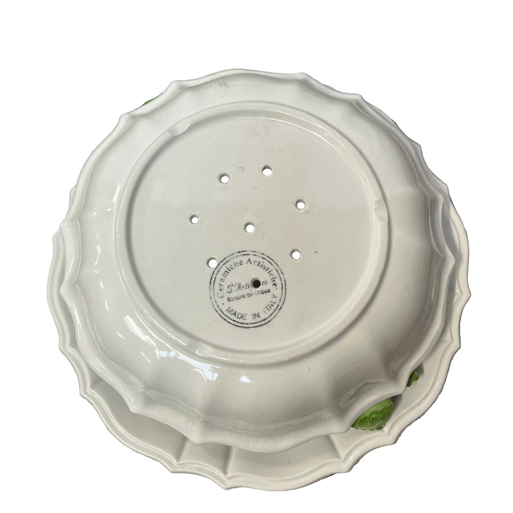 This charming Italian-made serving set features a scalloped plate paired with a berry sieving dish, accented with hand-detailed strawberry motifs. Both decorative and functional, it’s perfect for rinsing and serving fresh berries or as a standout tabletop display.
