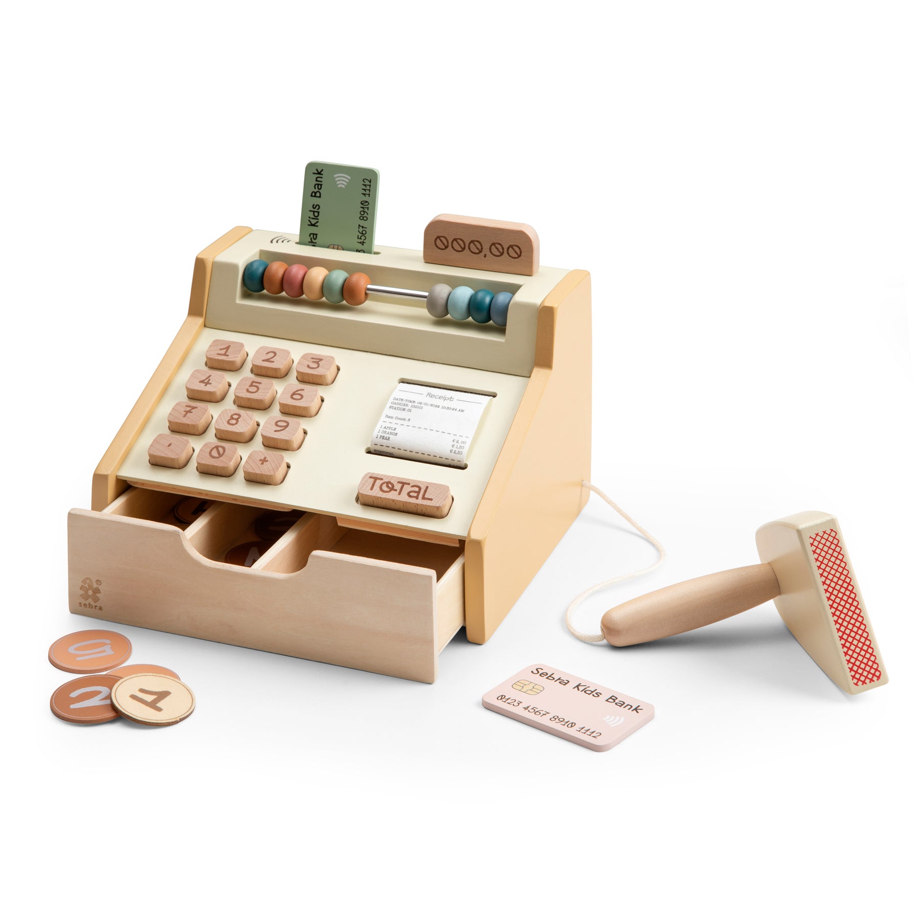 The wooden cash register has a pull-out drawer for the included Sebra wooden coins (values 1, 2 and 5), a ball frame with ten balls, push-buttons with numbers (plus (+), comma (,) and “total”), a scanner, two credit cards, a credit card reader and a fabric receipt roll.